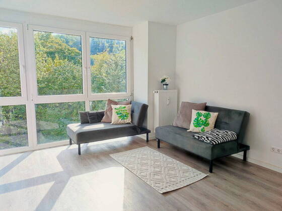 Mehr zum Angebot Stilvolle 2,5-Zi.-Designwohnung mit Wintergarten, voll möbliert, TG-Stellplatz & Blick ins Grüne: